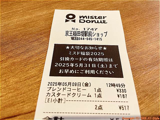 ▼ミスタードーナツ 京王稲田堤駅前ショップ 1回目の訪問履歴~2025年05月~